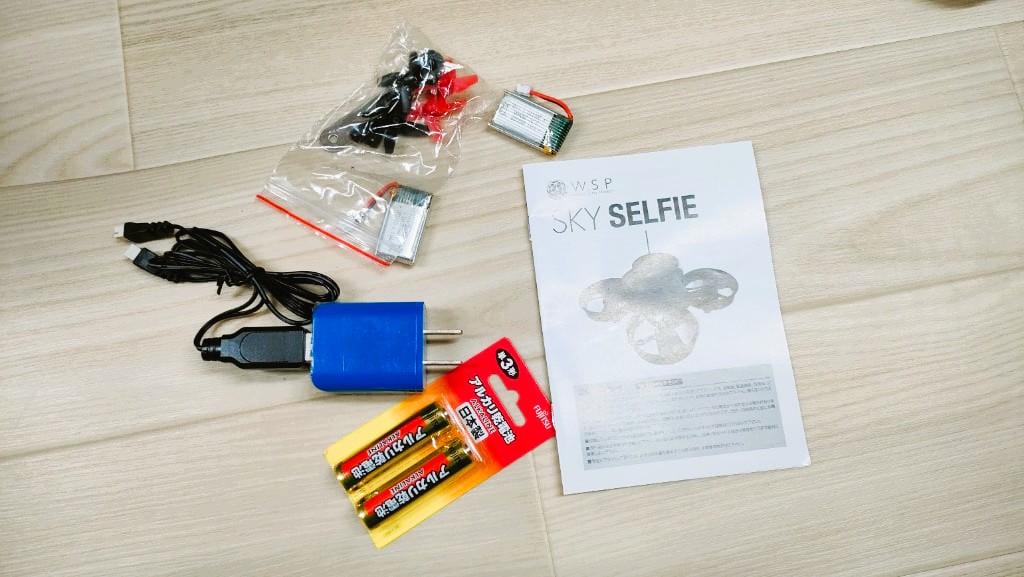 ■ 付属品本体/SKY SELFIE用キャリングケース(ソフトタイプ)/ コントローラー(コントローラー(単三電池2本付き))/ 交換用プロペラ×4(黒2、赤2)/USB充電ケーブル×2/ LiPoバッテリー×3/2ポートUSB ACアダプター/ コントローラー用アタッチメント2種類/スマホ取付用クリップ/ プロペラ取り外し用工具